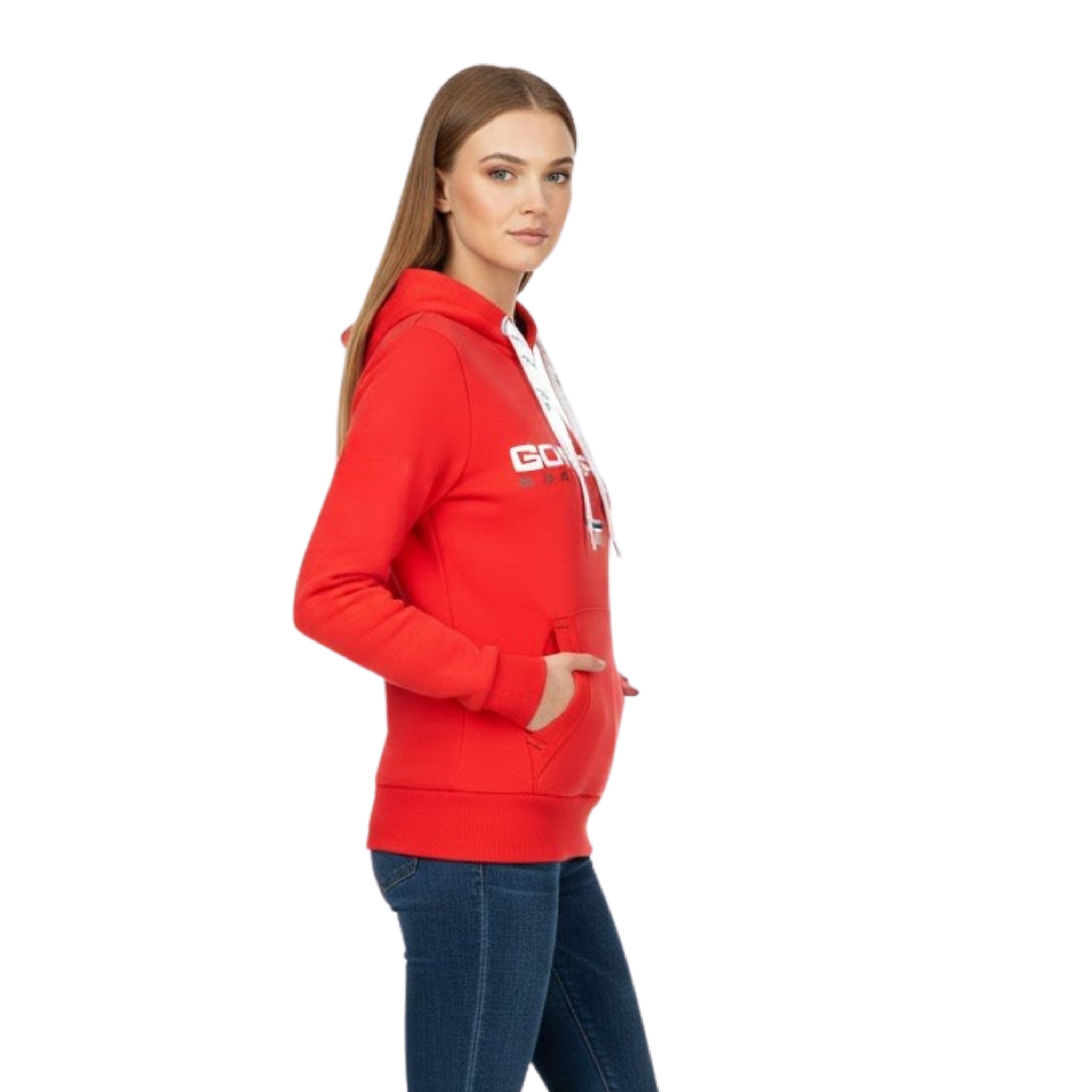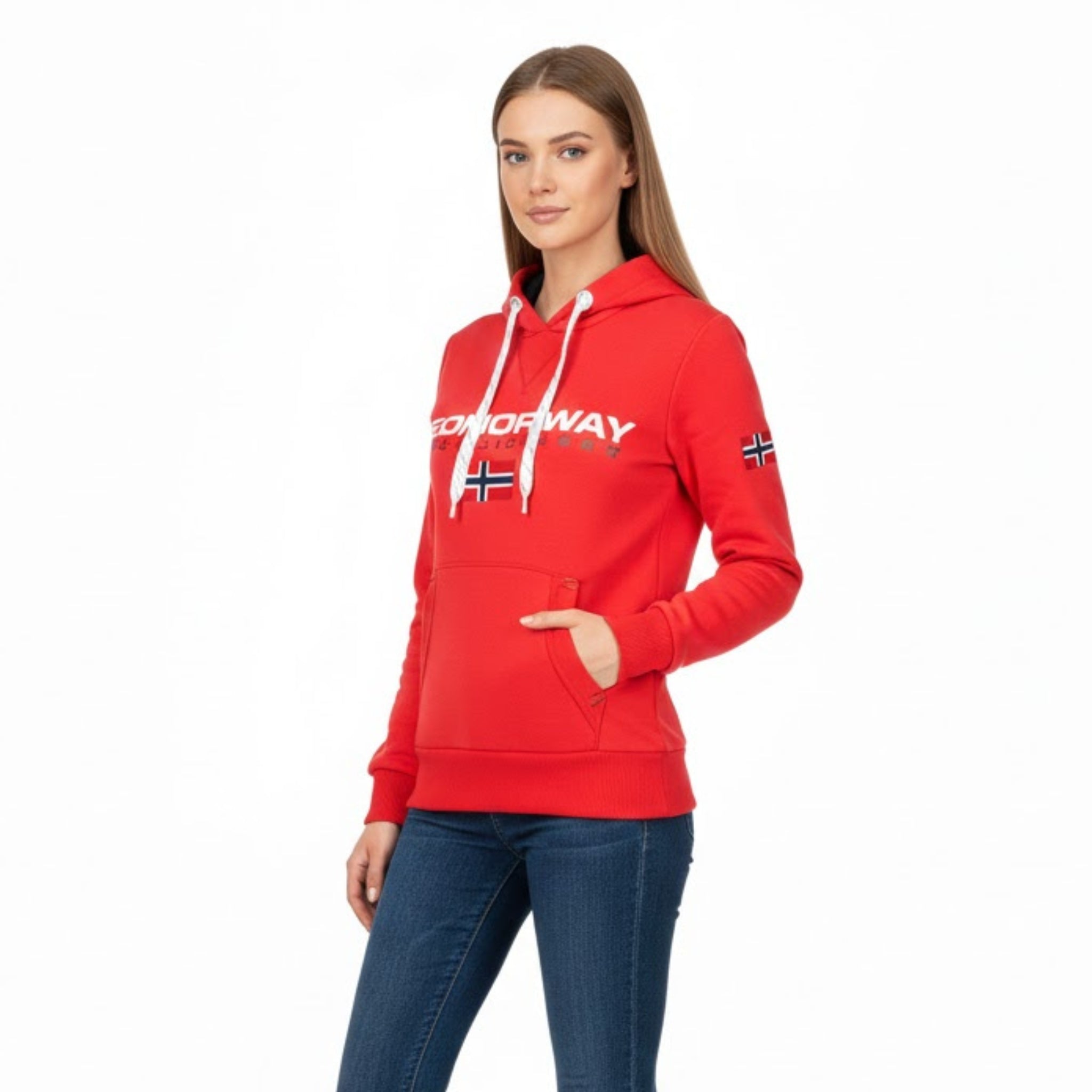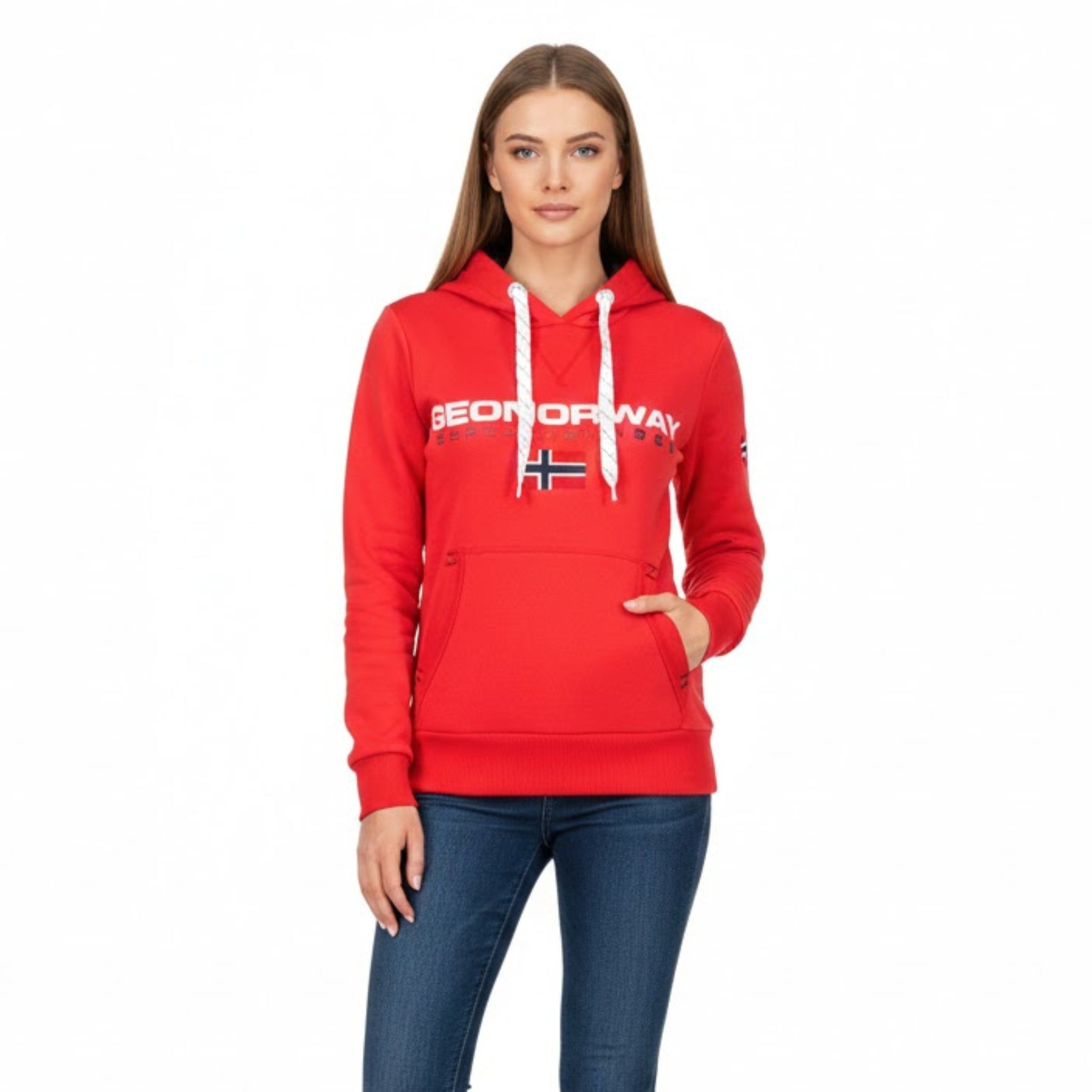 Scoprite la felpa "Goliver" da donna di Geographical Norway, un capo comodo e alla moda. Con chiusura a strappo, cappuccio, stampa frontale, tasche a canguro sui lati e una bandiera sul davanti e sul braccio, questa felpa offre uno stile moderno e casual.