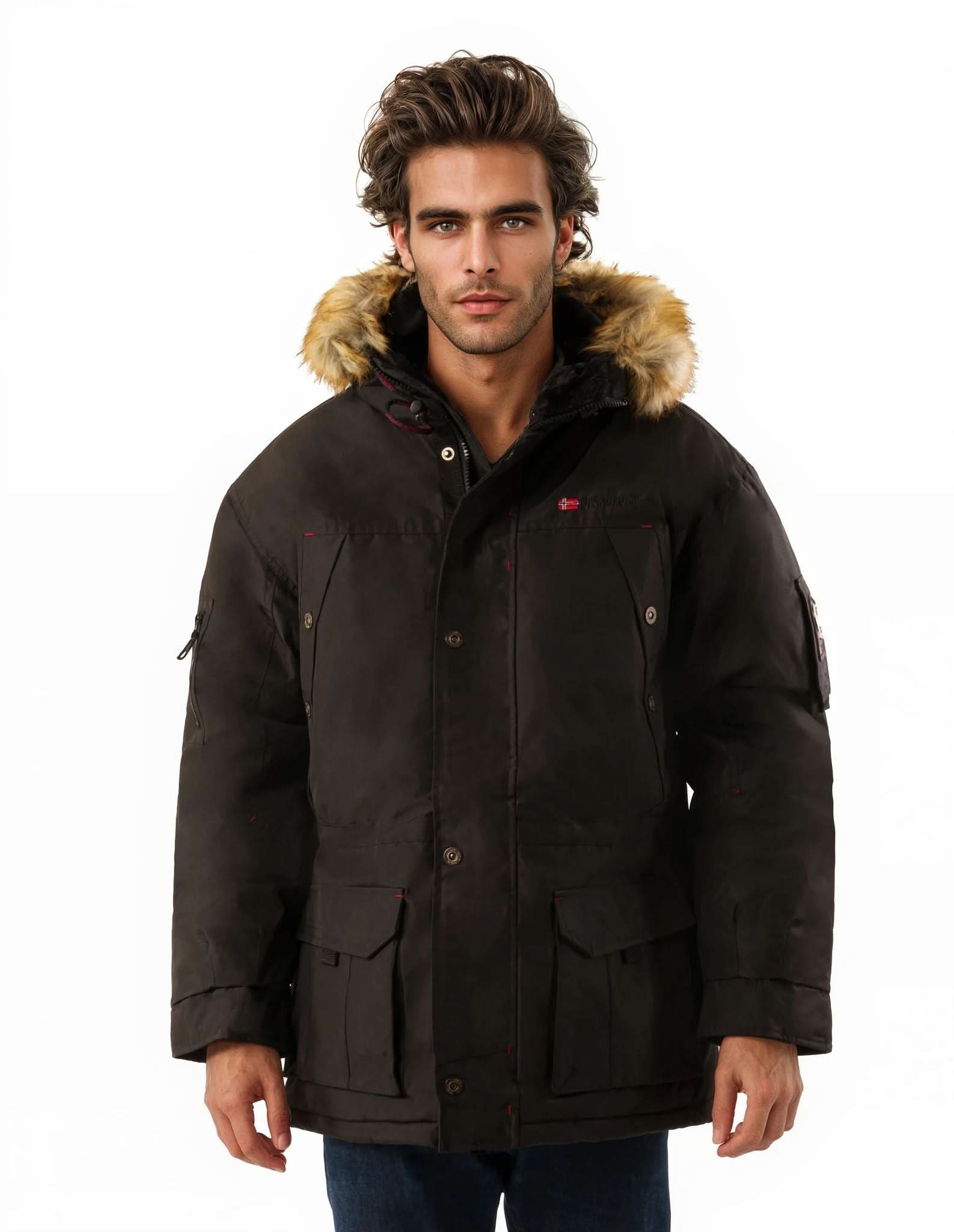 Découvrez la robuste parka "ABIOSAURE" de Geographical Norway, le vêtement outdoor indispensable pour vos aventures hivernales. Sa fermeture zippée et à boutons de pression assure une protection optimale contre le froid. La capuche ajustable, bordée d'une fausse fourrure synthétique détachable, vous permet de vous adapter aux conditions changeantes. Les broderies délicates sur la poitrine, ainsi que les badges sur la manche et la capuche, ajoutent une touche de style authentique. Avec ses multiples poches, dont une zippée sur la manche, cette parka allie fonctionnalité et élégance pour vous accompagner dans toutes vos expéditions