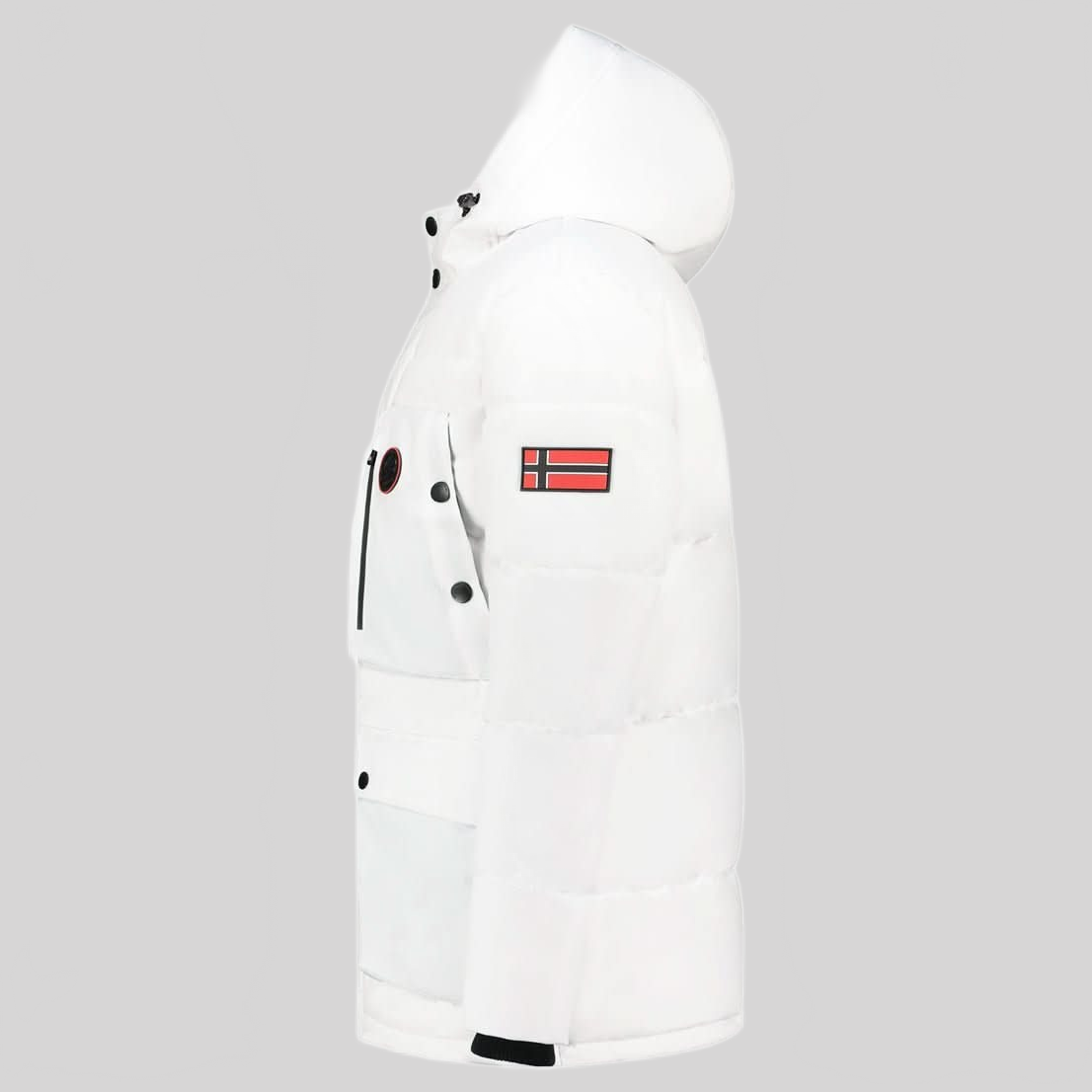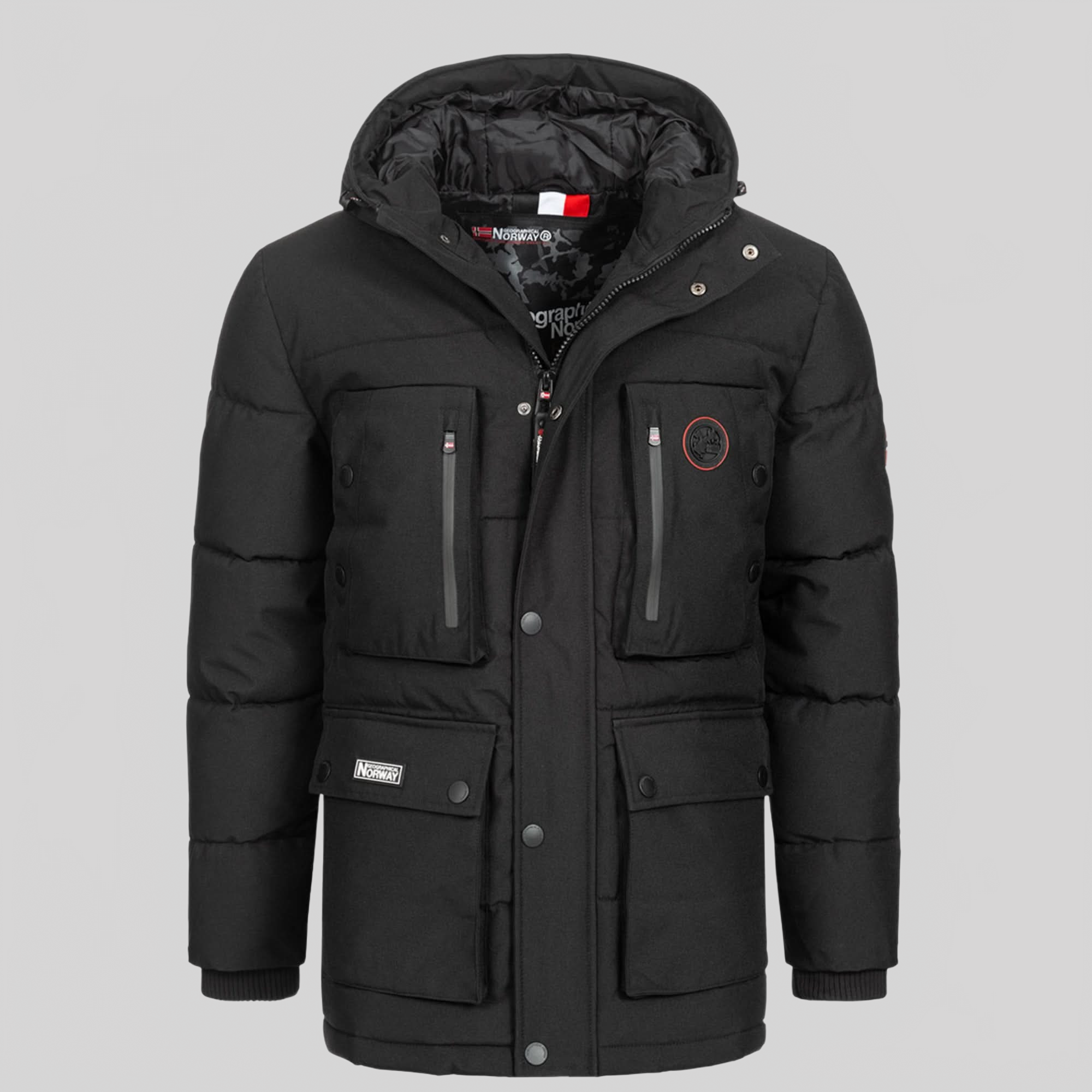 Découvrez la parka "ALBERT" pour homme de Geographical Norway, une pièce polyvalente dotée d'une fermeture zippée, de boutons de pression, d'une capuche ajustable et de multiples poches pour un style urbain et fonctionnel.