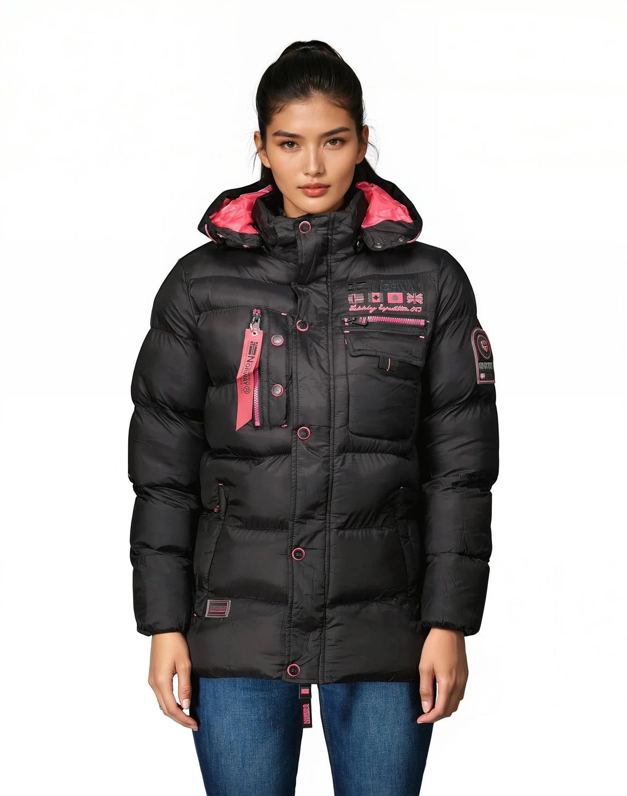Découvrez la doudoune matelassé femme "CITERNIER" de Geographical Norway. Ce blouson présente des détails de marque et une capuche amovible, plusieurs poches sur le devant, des badges en PVC sur le bas du vêtement, le haut de la capuche, la manche et le dos du col, ainsi que des broderies sur la poitrine.