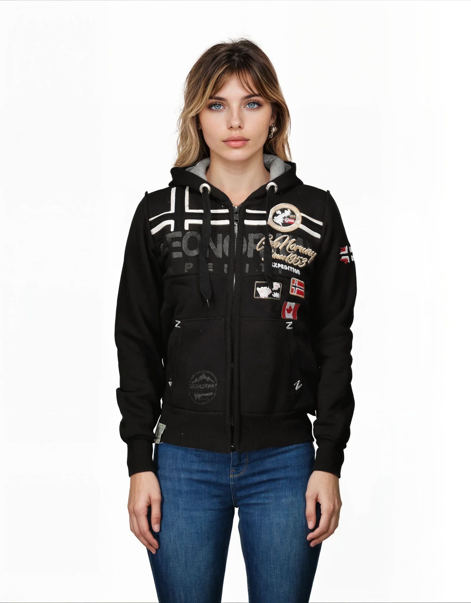 Découvrez le sweat avec capuche "GARADOCK" de Geographical Norway pour femme, une pièce confortable et tendance. Son ouverture zippée sur le milieu, ses impressions et broderies sur le devant et les manches ajoutent une touche distinctive et stylée à ce sweat.