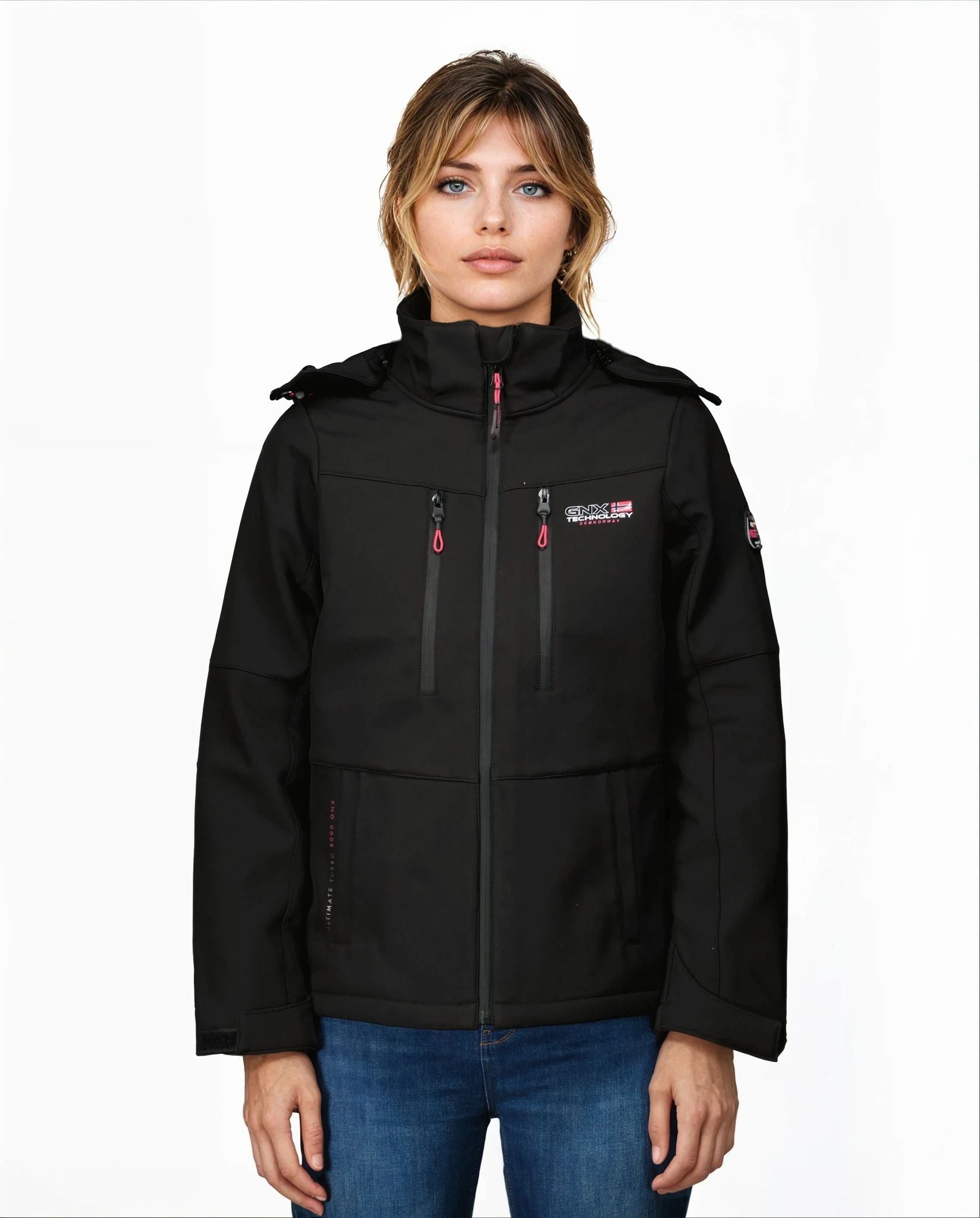 Découvrez la softshell à capuche "Timmex" de Geographical Norway pour femmes. Cette veste fonctionnelle offre une capuche et deux poches à zip injectées sur la poitrine, ainsi qu'un badge en PVC sur la manche.